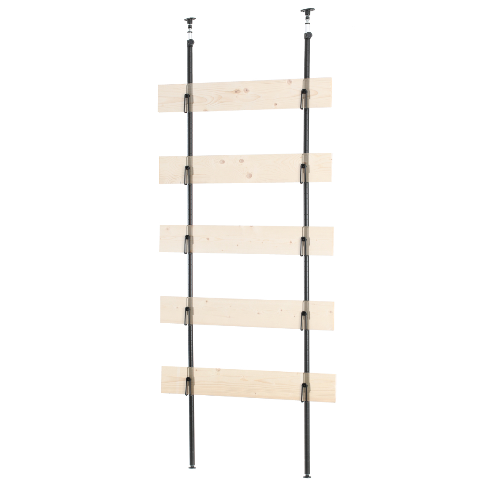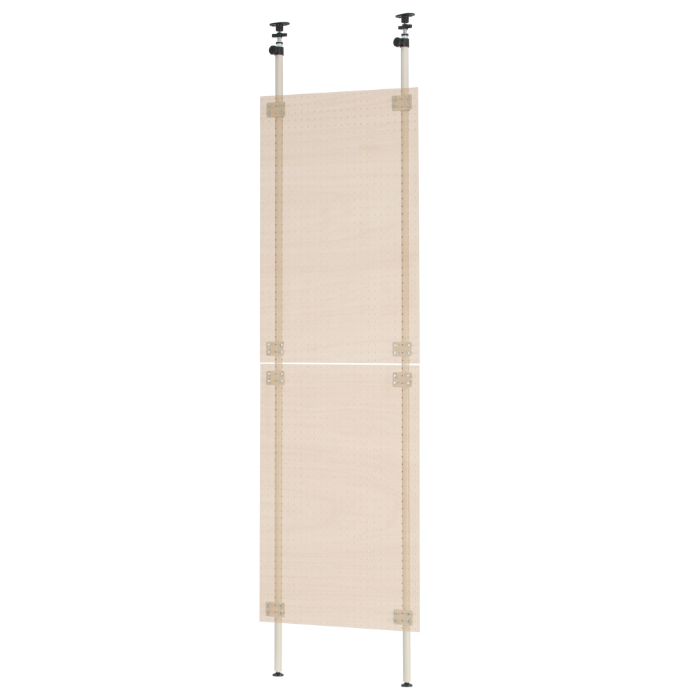 最初に仕組みを簡単に説明すると、「2レッグウォール」「2レッグペグウォール」ともに、中心となるのは直径25mmのスチールパイプ製ポール2本。組み上げた2本のポールをそれぞれ天井と床とに縦方向に突っ張らせて設置、このポールの間に市販の木材を渡したり、あるいは有孔ボードを固定することで、天井や壁を傷めることなく空間を仕切ったり、ちょっとした収納を作れるのです。