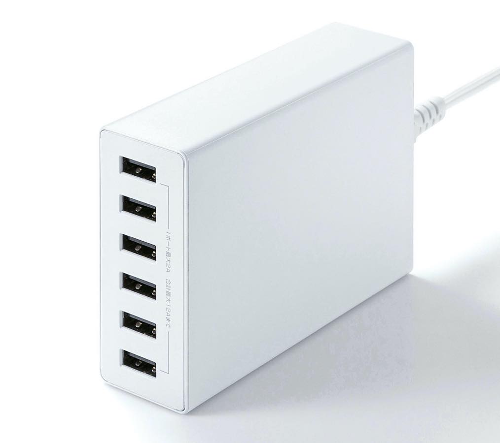 「ACA-IP67BK/W」(9240円)は、USB-Aポートを6口備えた充電器。すべてのポートが最大2Aまでの出力に対応しており、スマホやタブレットなど、最大6台同時での充電を行えます。