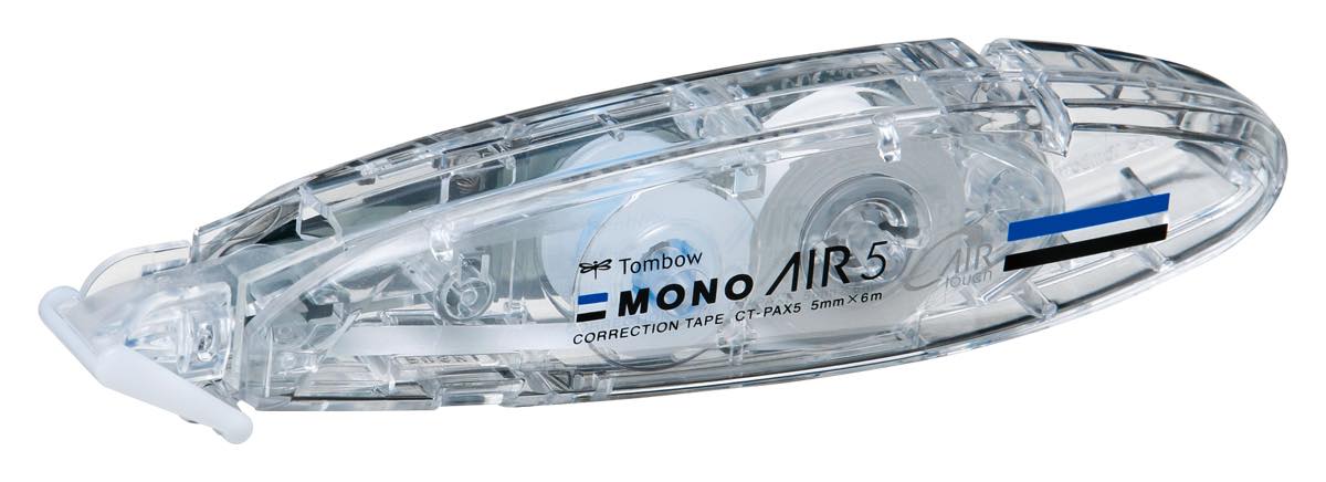 「モノエアーペンタイプ」が、よりスムーズにテープを軽く引きやすくなったのは、トンボ鉛筆独自の「エアータッチシステム」を採用したため。これは、修正テープのヘッド部分を紙面に押し当てたり離したりする力を利用して、修正テープの走行をコントロールする独自機構です。