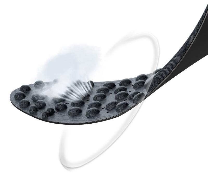 歩行時や走行時に足裏へ圧力がかかると、かかと部に配された対流エアセル(エアクッション)内部の空気が循環することで圧力を分散。体感で約30%の減圧に導くとともに、足裏全体を優しく包み込みます。また、インソールの前方には無数の穴が開けられており、靴の中の通気性を確保。嫌なムレを防ぎ、快適な履き心地を実現します。