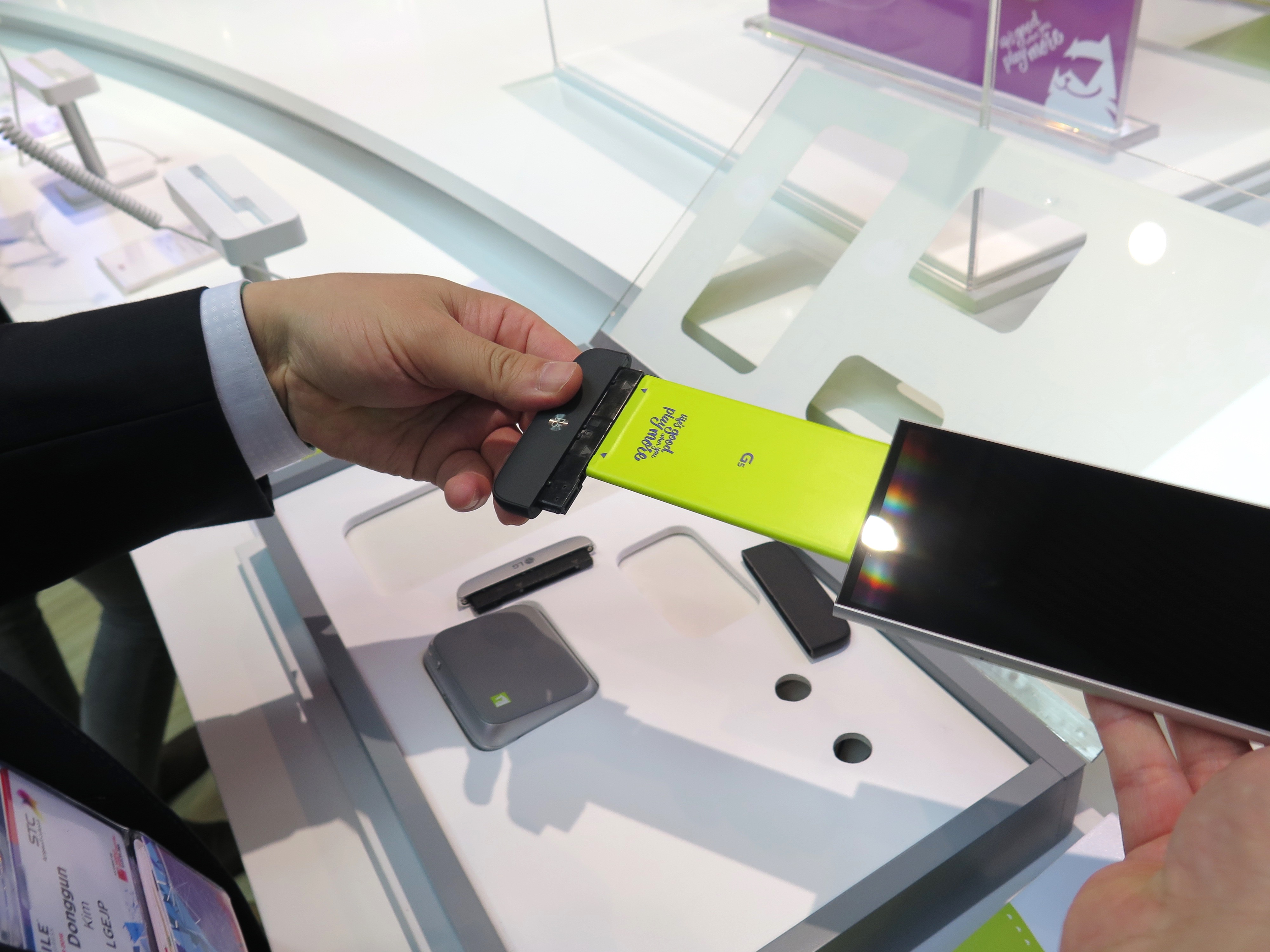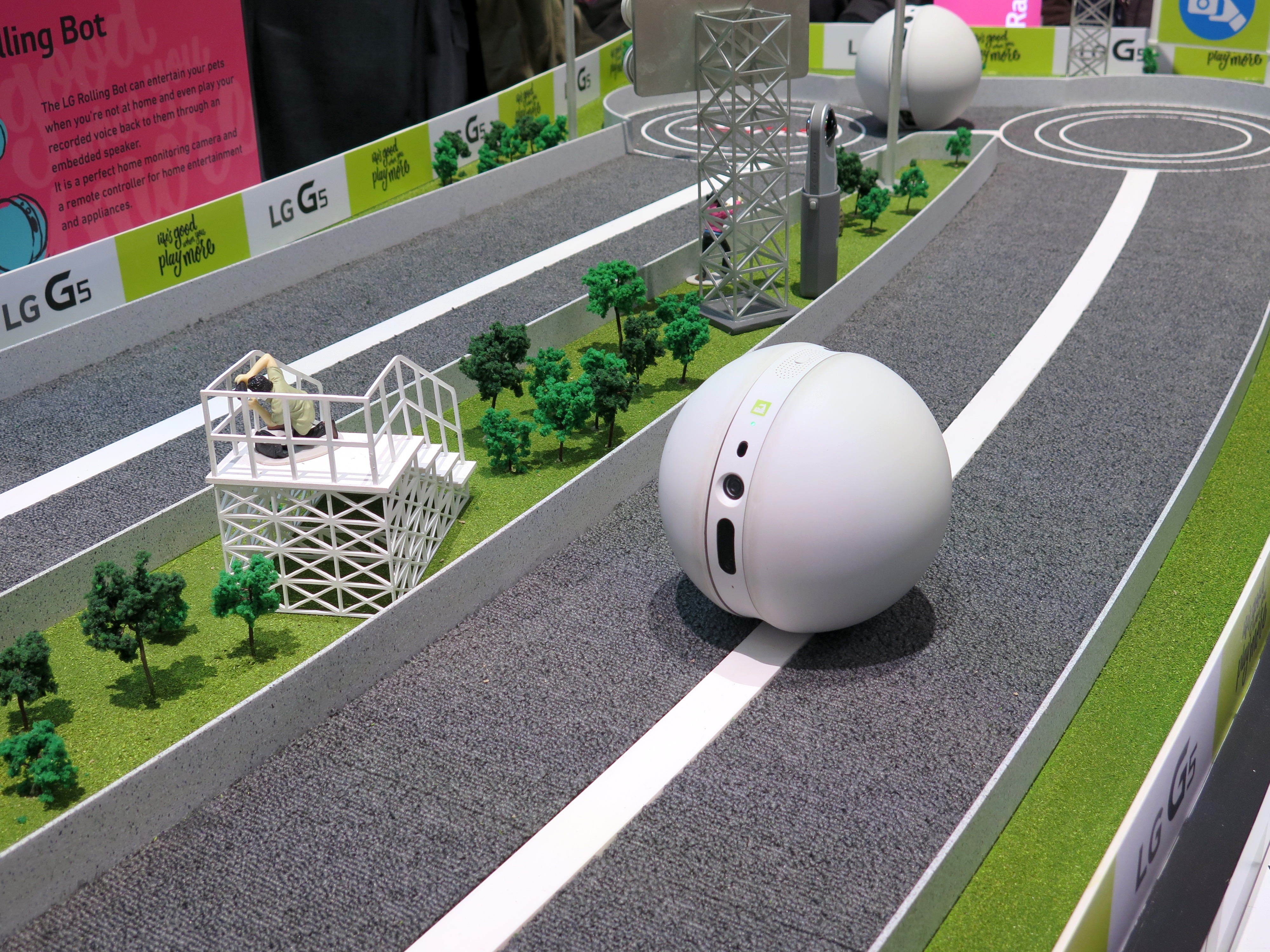 さらに、LG G5で遠隔操作ができる「LG Rolling Bot」というロボットも発表。カメラを搭載しているので、外出先からペットの様子などを確認でき、ペットの目線での撮影もできます。Bluetoothスピーカーとしても使えて、エアコンのオン・オフといった家電の操作もできるとのこと。