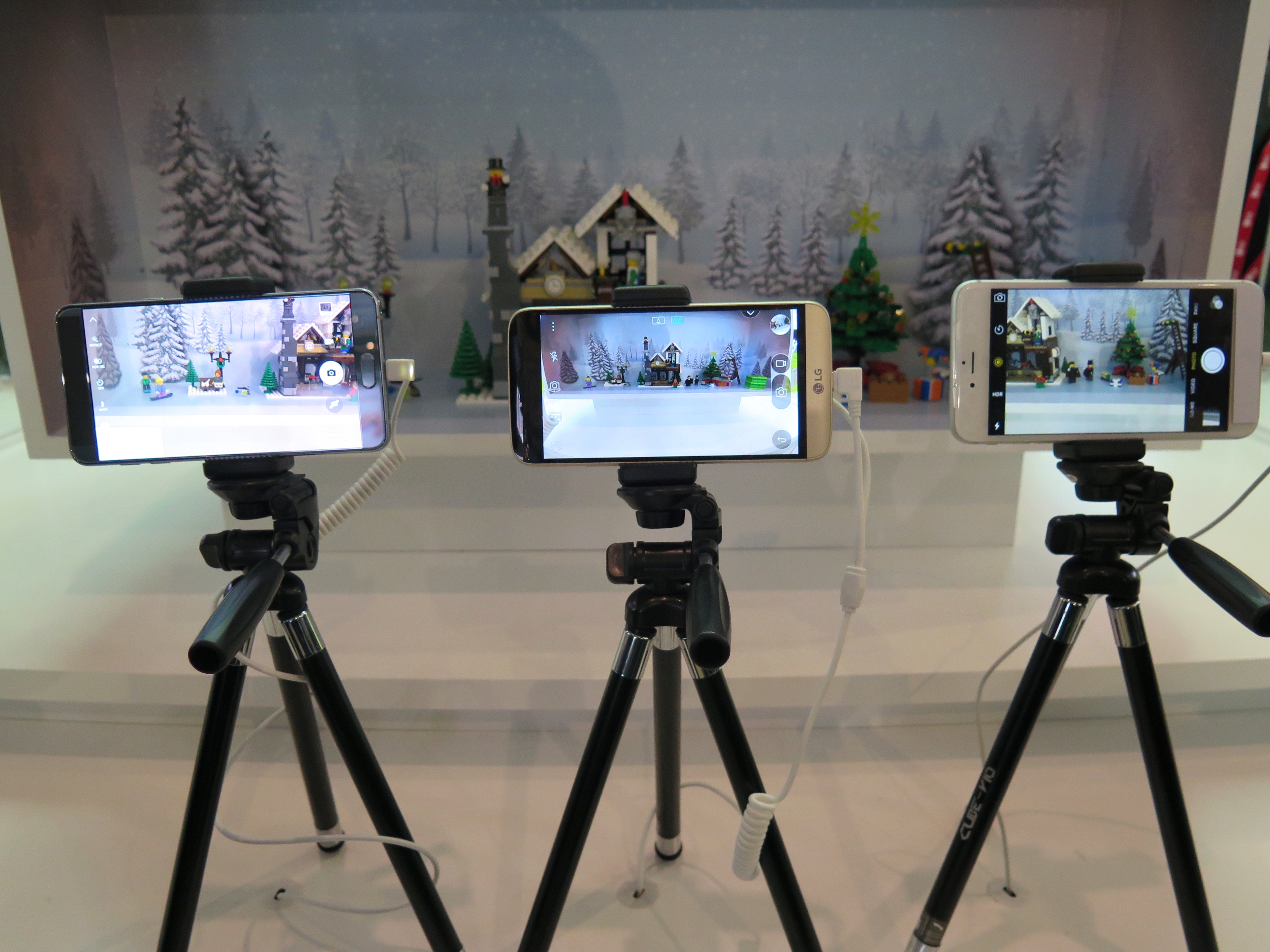 背面カメラは、16メガピクセルの標準カメラと8メガピクセルの広角カメラの2眼構成。近い距離でも広い範囲を写せるので、旅行のスナップ写真を撮るときなどに重宝しそうです。下の写真の中央の端末がLG G5。左右はライバル機種です。