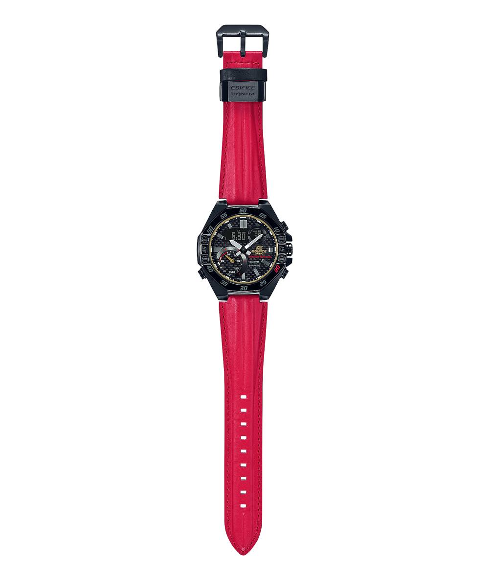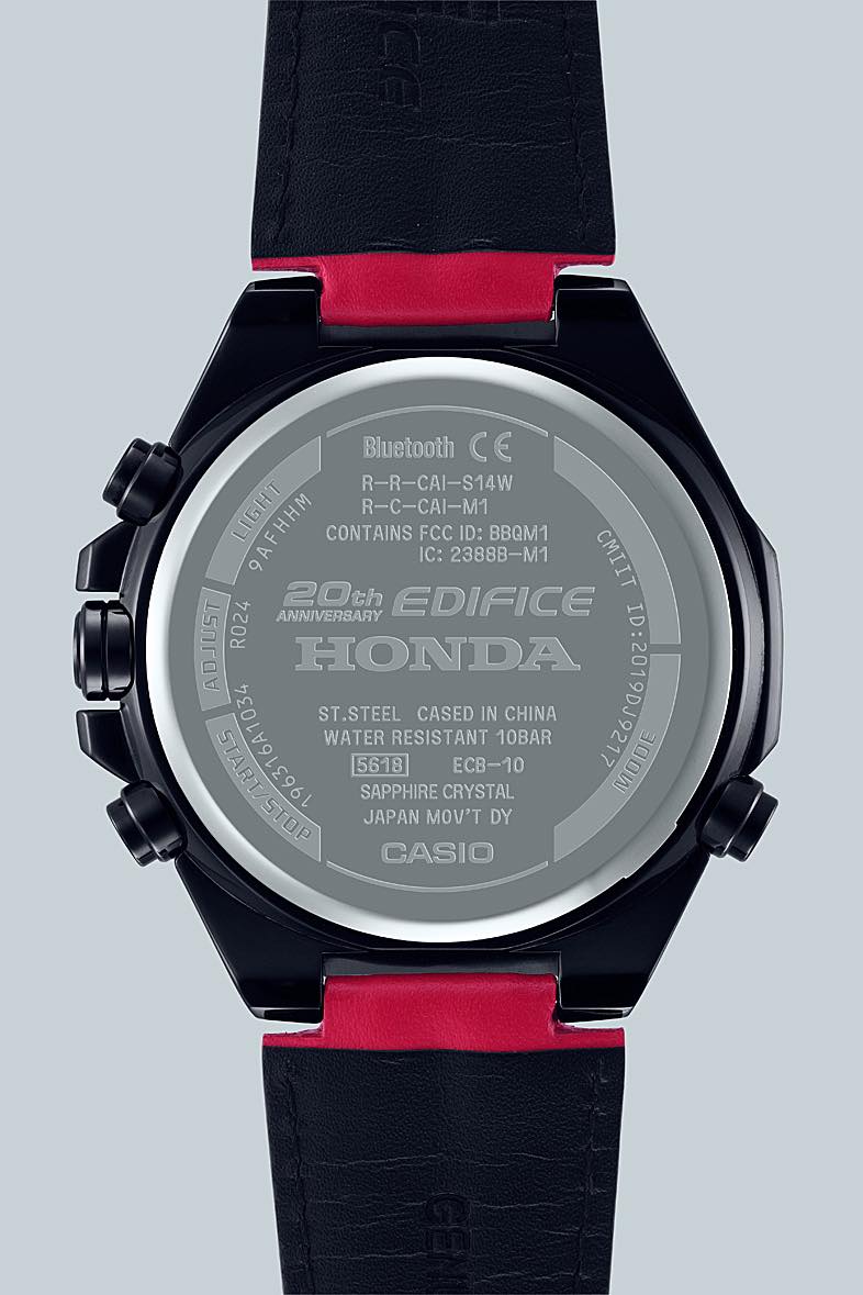 背面にはHondaのロゴとともに、“20th Anniversary EDIFICE”の記念ロゴを刻印。ポイントカラーのレッドを差したベゼルの「20」の数字は、もちろんEDIFICE誕生20周年を祝福するもの。インダイヤルの針や3時位置のEDIFICEロゴ、ベゼル内周を縁取るゴールドも、記念モデルにふさわしい華やぎを添えています。発売は4月24日より。