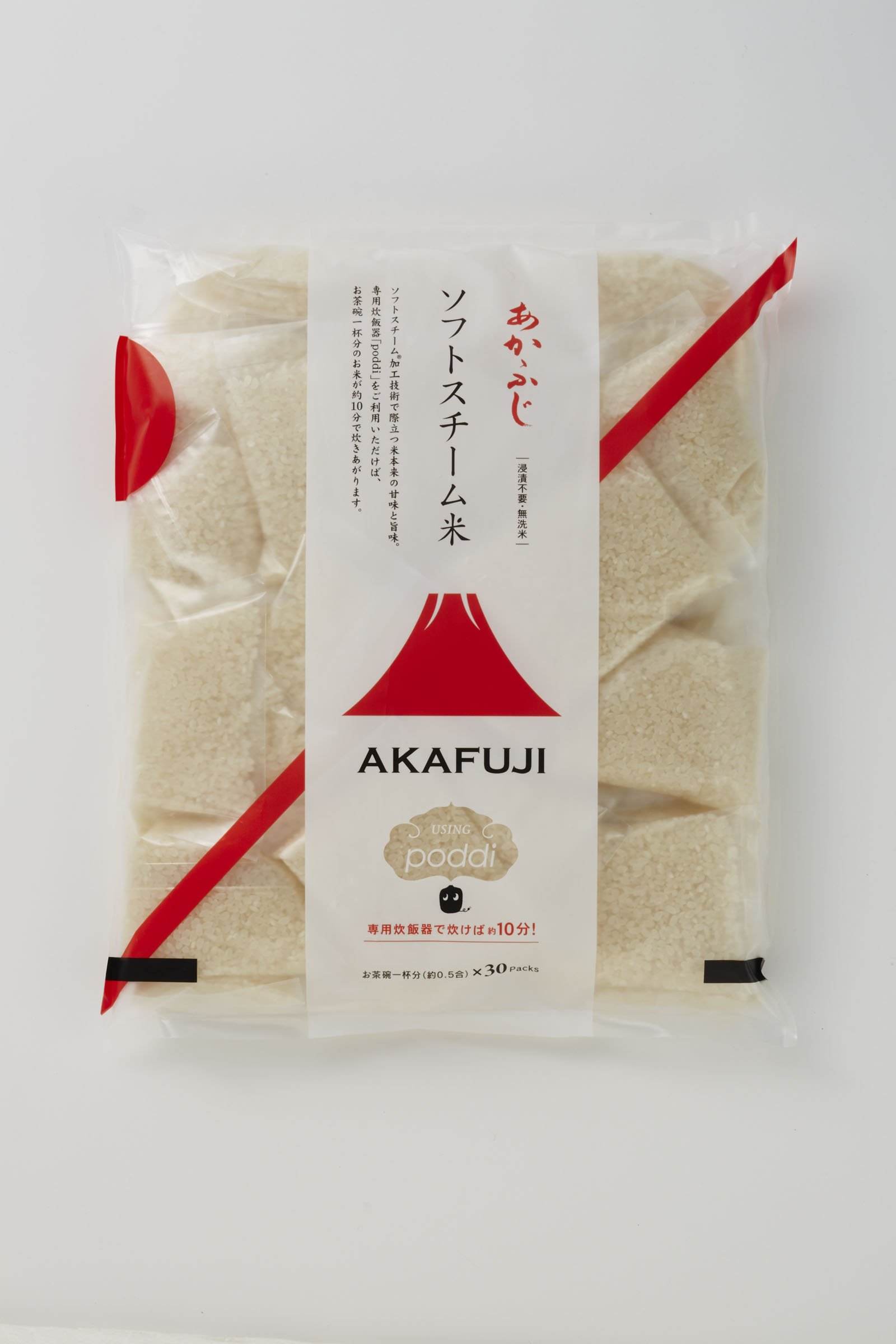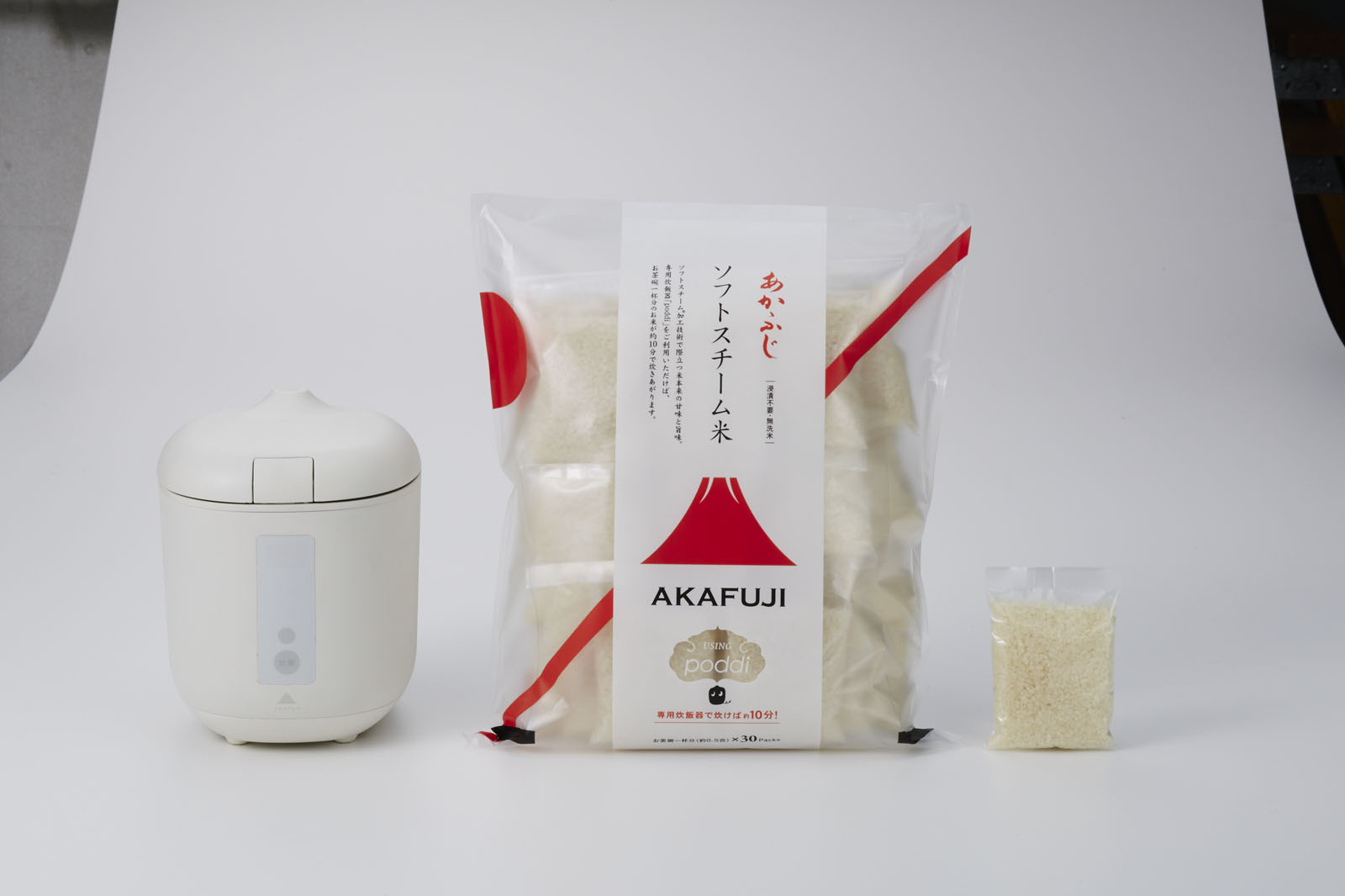 そして、その特長はなんといってもスピード炊飯。同時発売の専用米「ソフトスチーム白米」を使うことにより、0.5合につき蒸らし時間を除いて約10分での炊飯が可能となるというのです。ソフトスチーム白米は、75g(0.5合)×30袋入りで2680円で販売されています。