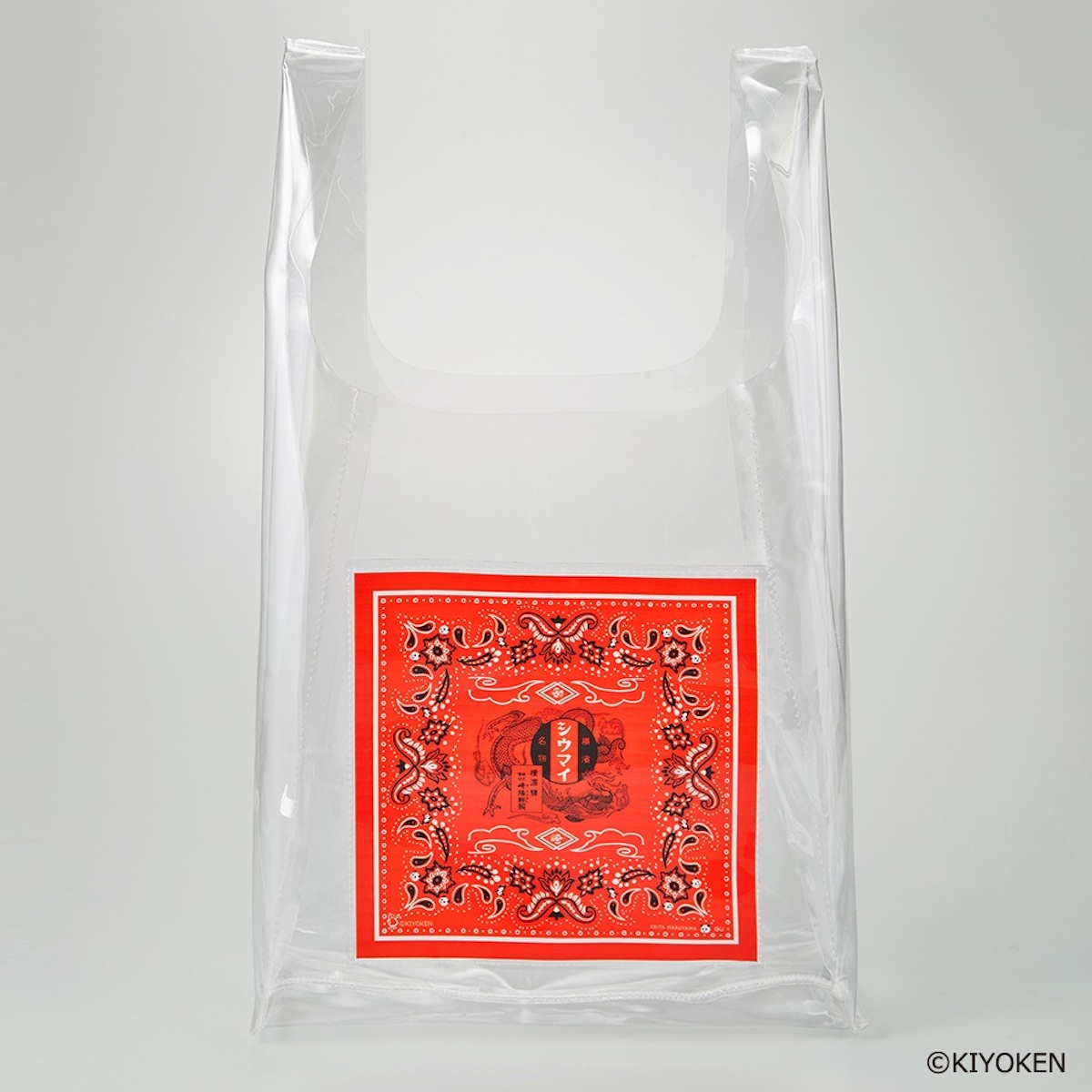中央の崎陽軒のロゴの周りをボタニカルな柄で縁取った「バンダナ」(990円)と「クリアバッグ」(1990円)は、「あれ?よく見たら崎陽軒?」となること請け合いのアイテム。