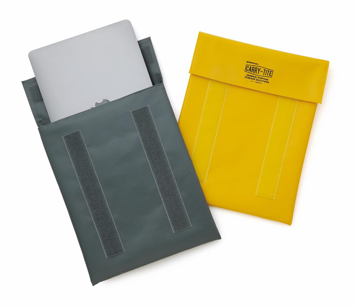 サイズはW270×H330×D10mmと、13インチのノートPCやタブレットがちょうど収まるサイズ感。カラーリングは、グレー、ブラック、ホワイト、レッド、イエロー、オレンジ、ライトブルー、カーキの鮮やかな全8色展開で、マジックテープ部分は生地と同色に揃えています。