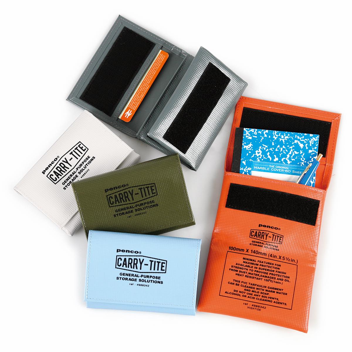 同シリーズの「キャリータイト」(1500円/税別、サイズ:W200×H80×D15mm)や「キャリータイト S」(1100円/税別、サイズ:W107×H77×D5mm)も同じく全8色にて展開中です。収納物に合わせてふたつ折りや3つ折り、どちらでも使える2WAY仕様で、マジックテープの留める位置を変えることで形状を変化させられます。通常の「キャリータイト」は筆記具や小さめの工具入れ、「キャリータイト S」はカードやコイン、絆創膏など小物入れに適したサイズ感です。