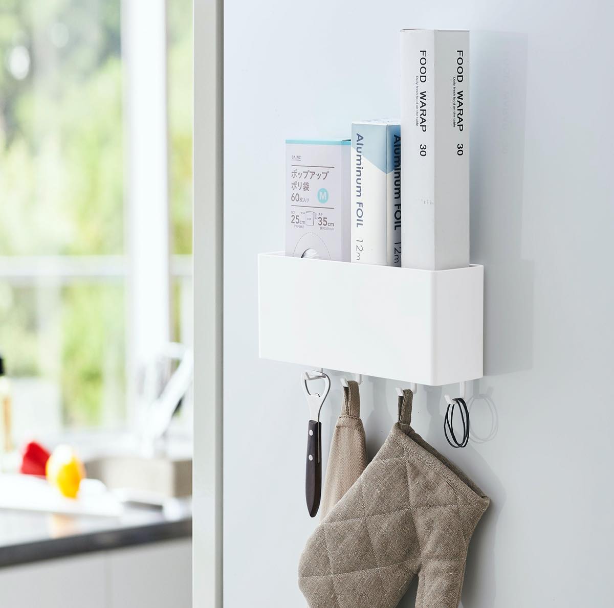 「マグネットストレージ シリーズ タワーワイド」は、マグネットが付く冷蔵庫や洗濯機、浴室のパネルなどに、簡単に取り付けられる収納ケースです。3枚の仕切り板で仕分けされているので、ラップなどの長めのものを収納するのに便利。付属のフックで、底部分に鍋つかみや布巾、栓抜きなどの小物も掛けられます。W24.5×H10.5×D7.2cm、重量:420g、耐荷重:約3kg。