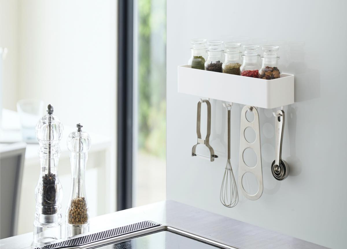「マグネットストレージラック タワー」は、前出の「タワーワイド」に比べて背が低いのが特徴。キッチンでよく使う調味料や洗面周辺のサニタリーグッズなどの収納にオススメです。付属フック付き。W24.5×H5.3×D7.2cm、重量:220g、耐荷重:1.5kg。