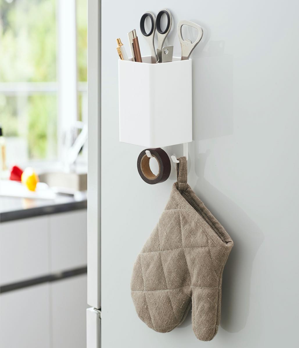 「ストレージアイテム」とは、空き容量を増やすこと。例えばキッチンやバスルームはもちろん、在宅勤務の普及で自室がオフィスに変わってしまったという人も、マグネットが付く環境であれば、ペタッと貼り付けるだけで、新しい収納スペースを確保できます。背面いっぱいのマグネットが、しっかり装着。ずれ落ちることなく、安心です。