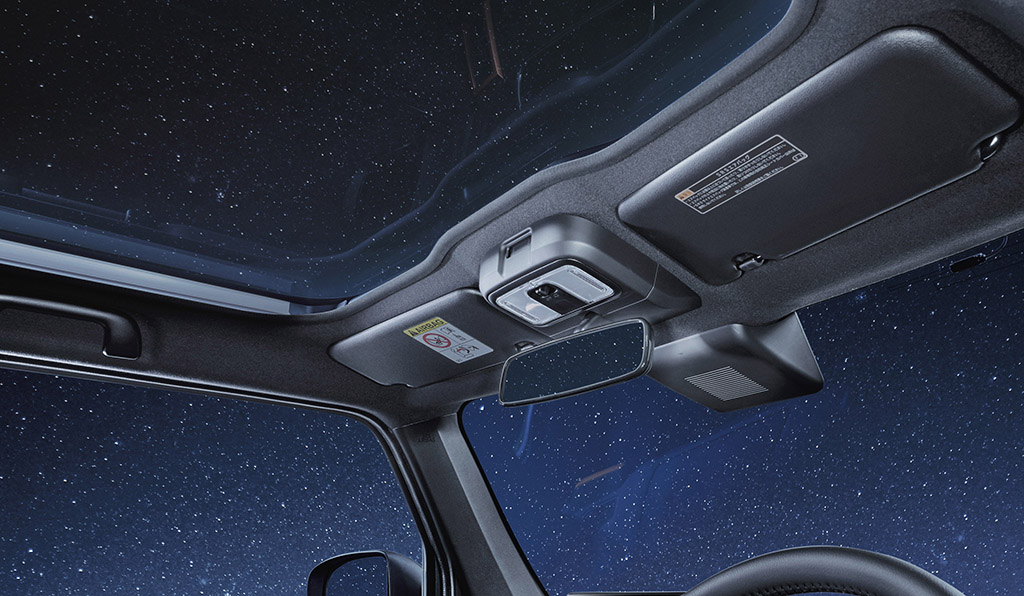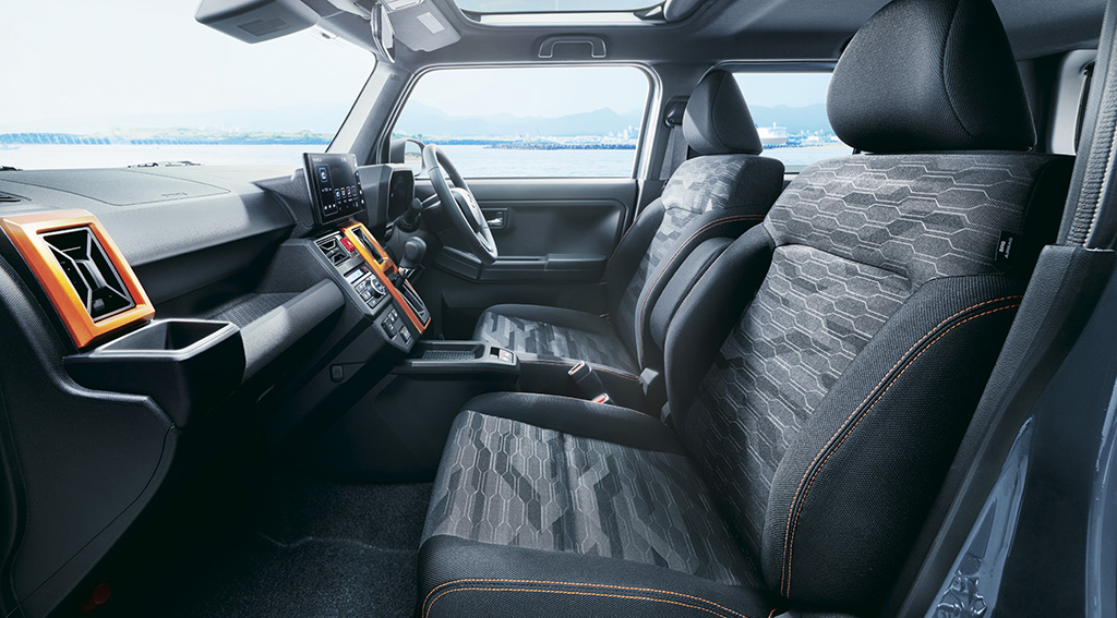 一方、趣味の道具としても活躍する新型タフトだけに、インテリアには遊び心を感じさせる装備が盛りだくさん。中でも目を惹くのは、ダイハツの軽自動車としては初の採用となる“スカイフィールトップ”です。これは、フロントシート上に設置された大きなガラスルーフで、なんと全グレードに標準装備。車内の開放感を格段にアップさせます。