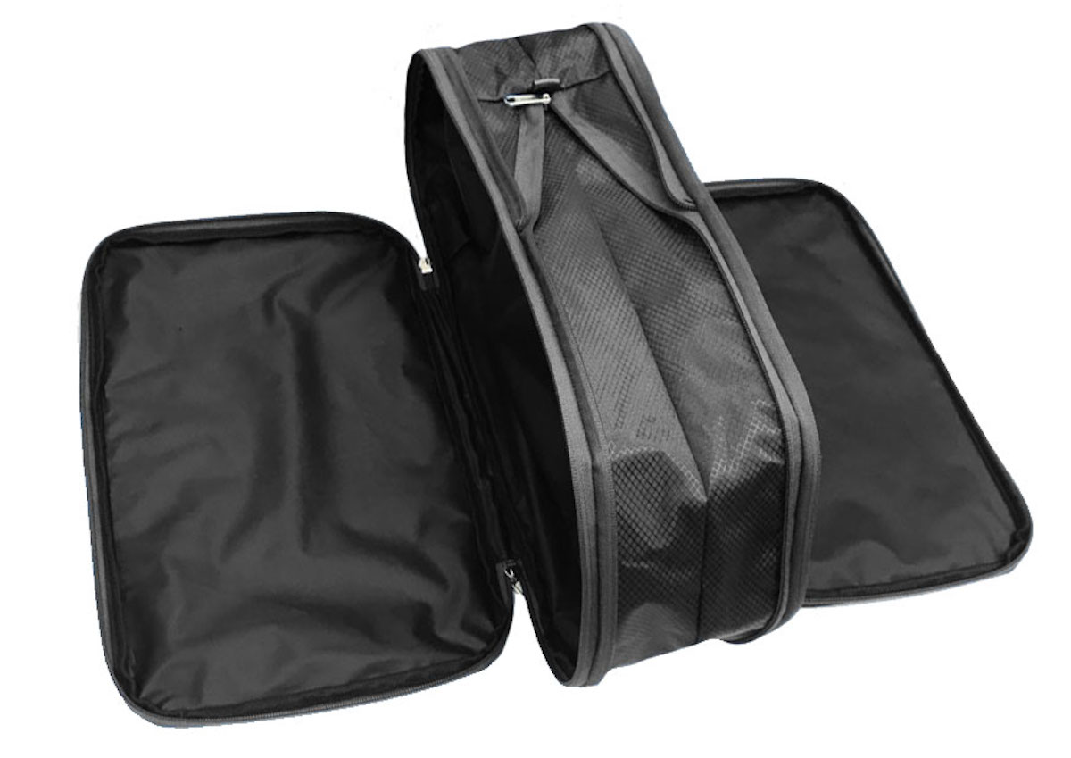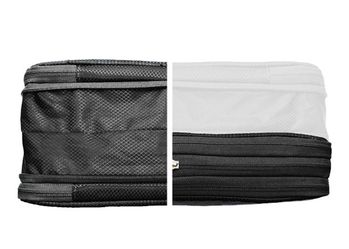 サイズは縦35cm×幅22cm、厚さは収納時約15cm、圧縮すると約7.5cmまでコンパクトになります。収納スペースは2気室に分かれており、「片方には着用前の清潔な着替え、もう片方には着用済み衣類」「片方にはニットやシャツ、もう片方には下着や靴下などのインナー類」などと使い分けるのに便利です。どちらのスペースもダブルファスナーで大きく開けられ、荷づくりしやすいのもポイント。