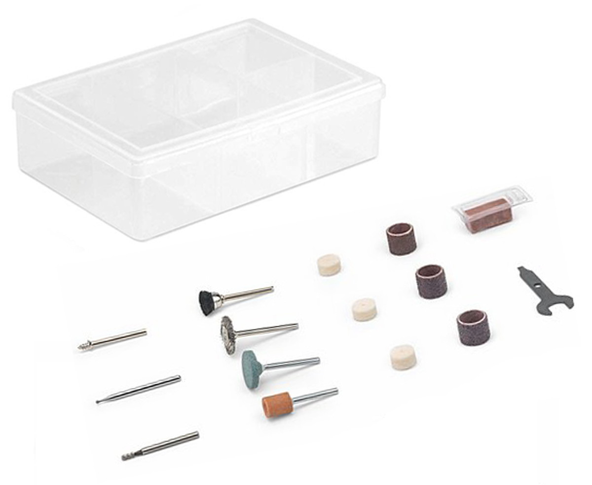 アクセサリーは全部で15ピースを標準装備。彫刻用のハイスピードカッターやダイヤモンドホイールポイント、研削用のシリコンカーバイド砥石、洗浄用のカーボンスチールブラシなど、用途に合わせて付け替えられます。「イージーツイストシステム」で、工具を使用しなくてもすぐ交換できるところも便利。