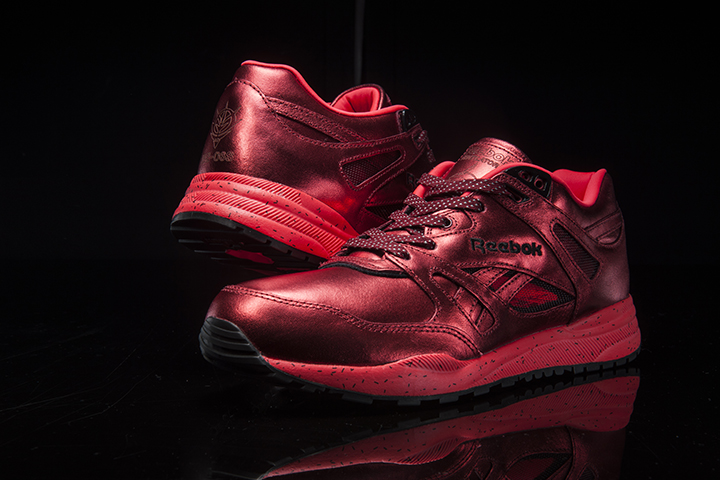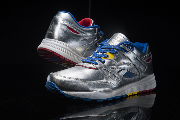 コラボレーションモデルの最大の特徴はメタリックな質感のアッパーだろう。ガンダムバージョンはシルバーをベースに、ブルー、イエローをアクセントに。一方シャア専用ザクバージョンは、アッパーだけでなく、ライニング、ミッドソールも赤で統一されている。シュータンに機体の頭部が描かれているのもポイントだ。