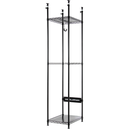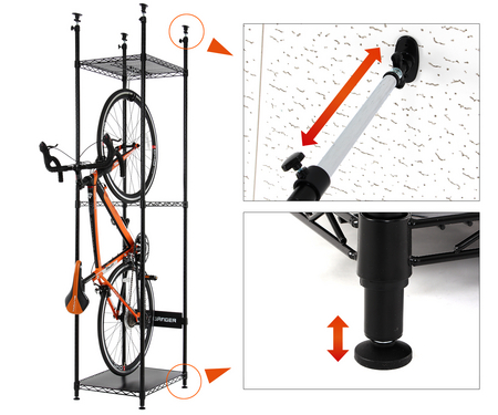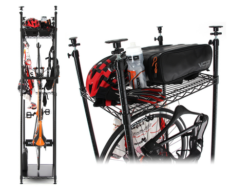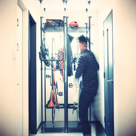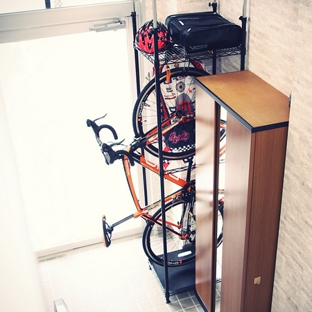 ビーズから発売されたDOPPELGANGER(ドッペルギャンガー)「バイシクルハンガー」は、自転車の前輪をフックに掛け、吊り下げて収納できるスグレモノ。 ヘルメットやグローブ、工具なども棚にまとめて収納可能です。 柱は伸縮式で、天井と床の合計8点で本体を支えるため、万が一の災害時にも転倒の危険性を軽減。