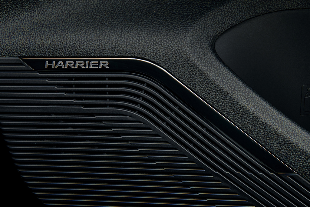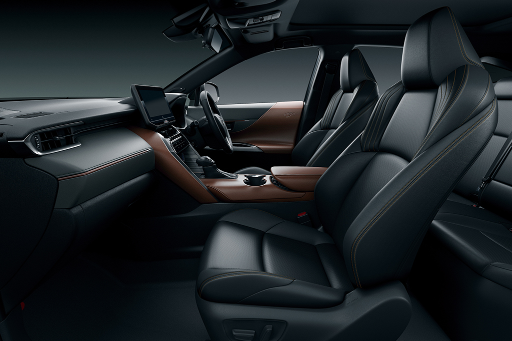 新型ハリアーのインテリアはマテリアルにも凝っていて、厚い革を曲げた時に生じる自然なシルエットを再現し、触り心地にもこだわったレザー調素材や、“曲木(まげき)”の質感に着想を得たウッド調のパネルを採用。さらに、パイピングによるアクセントを随所に配置することで、上質感をプラスしています。