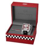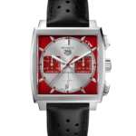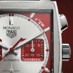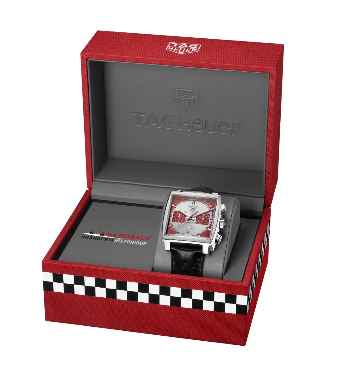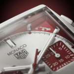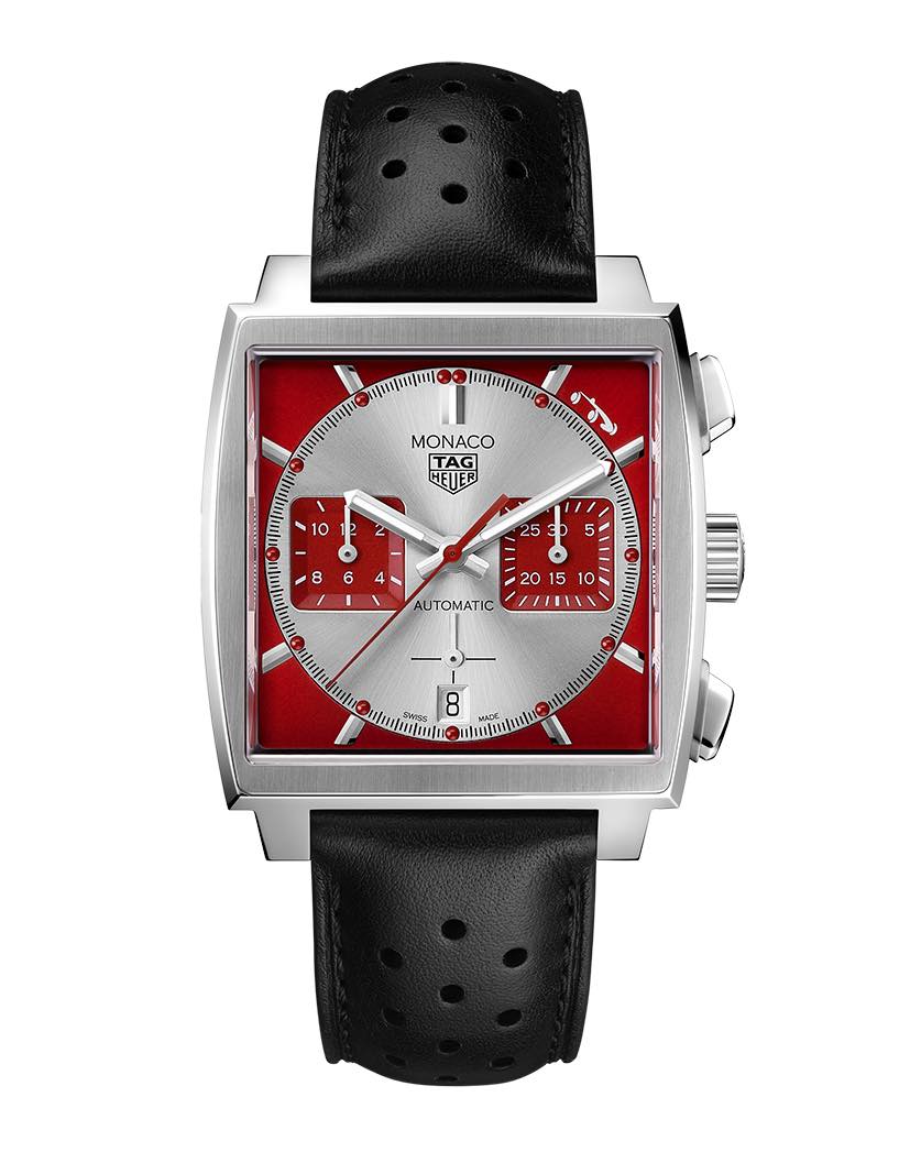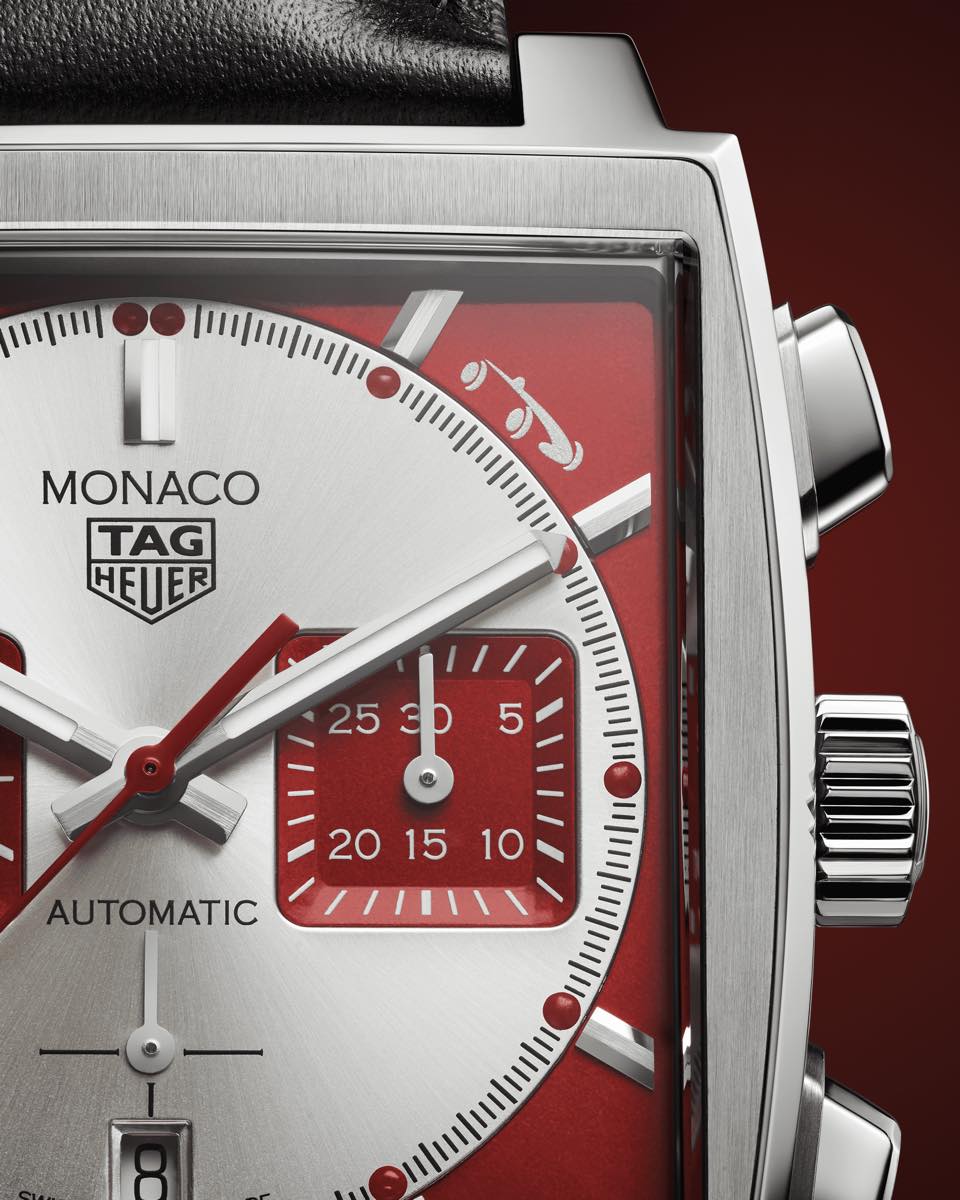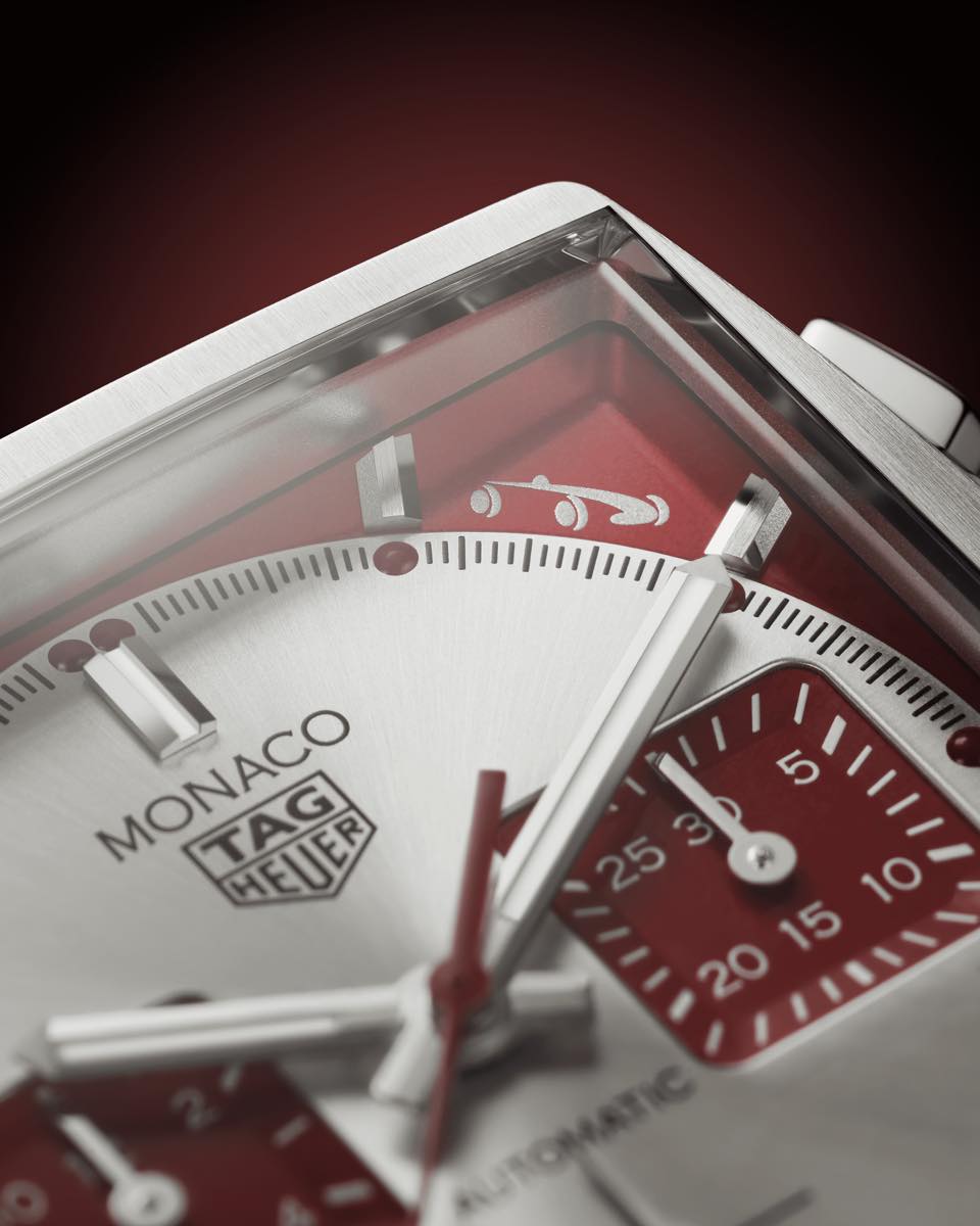 アイコニックなスクエアデザインのケースバックと、特徴的なふたつのサブダイヤルはそのままに、ダイヤルには疾走するスポーツカーをイメージさせるクリムゾンレッド(深紅)とホワイトの2色を採用。1時位置にはグランプリ・ドゥ・モナコ・ヒストリックのカーロゴをあしらった特別仕様です。