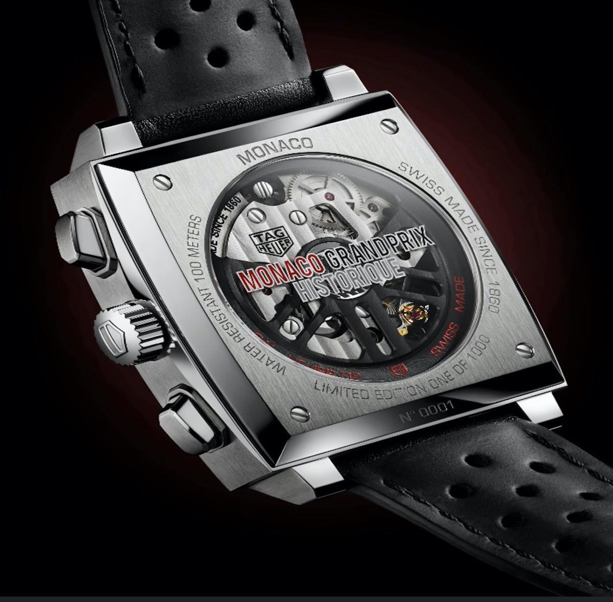 このクリアなサファイアガラスには、グランプリ・ドゥ・モナコ・ヒストリックのロゴを配置し、また、ケースバックには世界限定1000本を表す「One of 1000」の文字を刻印。