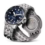 1938年から採用しているねじ込み式リューズとケースバック構造により、30気圧の防水性能を実現。逆回転防止ベゼルはセラミック製。ダイバーズとしては珍しくシースルーのケースバックも採用し、ムーブメントが誇らしげに顔を覗かせます。