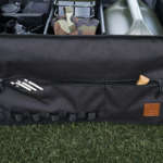 また、ワイドなサイズのフロントポケットが縫い付け式で備えられており、ペグやロープ、ナイフなどのキャンプ用具を荷室から分けて入れておます。