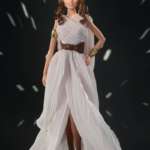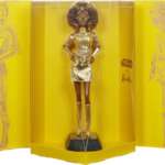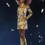 最も異色なのがC-3POにインスパイアされた「バービー/スター・ウォーズ C-3PO」。ドロイド特有の近未来的な姿にインスピレーションを受けています。C-3POの黄金のきらめきを表すスパンコールとオーガンジーがアクセントになったゴールドのドレスに、ゴールドの襟、バングルを合わせています。