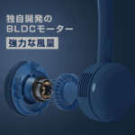 羽なしで強力な風を吹き出し、髪や衣類をはさみこまない安心設計。ファン内部のタービンが回転しながら空気を吸い込み、吹き出し口から風を送り出す時に起こる圧力差で強い風力を生み出すブレードレス方式を採用。独自開発のブラシレスDCモーターを搭載し、長時間使用しても壊れにくく強力な風を生み出します。