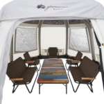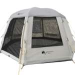 ドーム型スクリーンタープ「エアマジック オクタゴンドーム-BJ」は、 広々とした室内空間を実現しており、 チェアやテーブルを置けば大型リビングスペースとして快適に過ごせます。また天井のベンチレーションや壁面のメッシュ窓によりテント内の通気性も抜群。