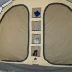 インナーテントにはふたつの出入り口を装備。出入り口の間には、小物を収納できるメッシュポケットが縦一列に4つ設けられており、テントの中で行方不明になりがちな小物も目に見える状態で管理できる、使い勝手のよい仕様です。