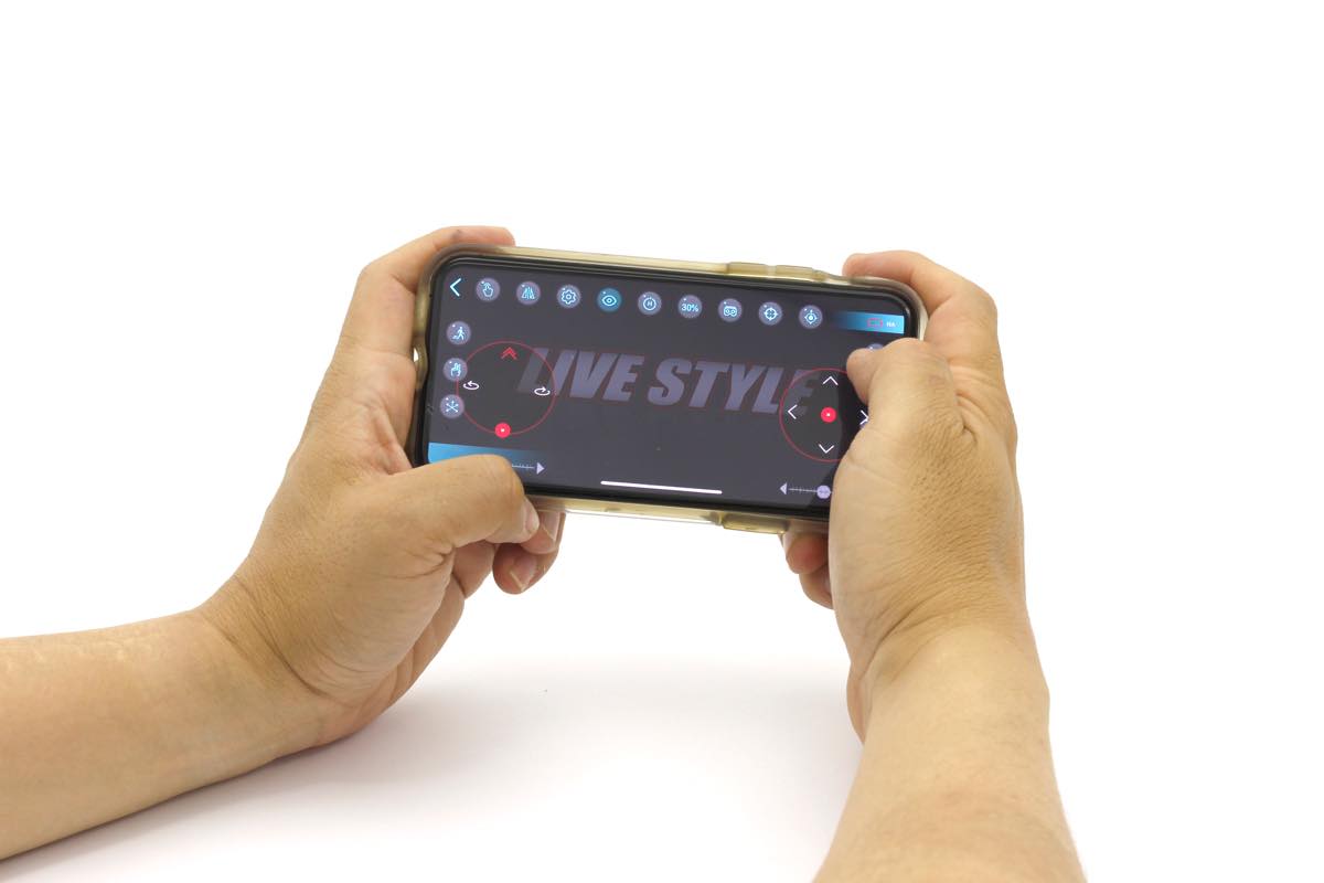 機体の正面に搭載されたカメラは、トイドローン市場最高級スペックの200万画素・720HD/フレームレート25fpsで、動画または静止画を撮影可能。また、機体底面に搭載されたカメラは、30万画素で上空から撮影ができ、専用アプリで正面と底部のカメラを切り替えられます。
