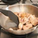 調理が終わって、いよいよ盛り付け。サイドに浅く立ち上がりを付けたスコップのような形状は、一気に料理をすくえます。
