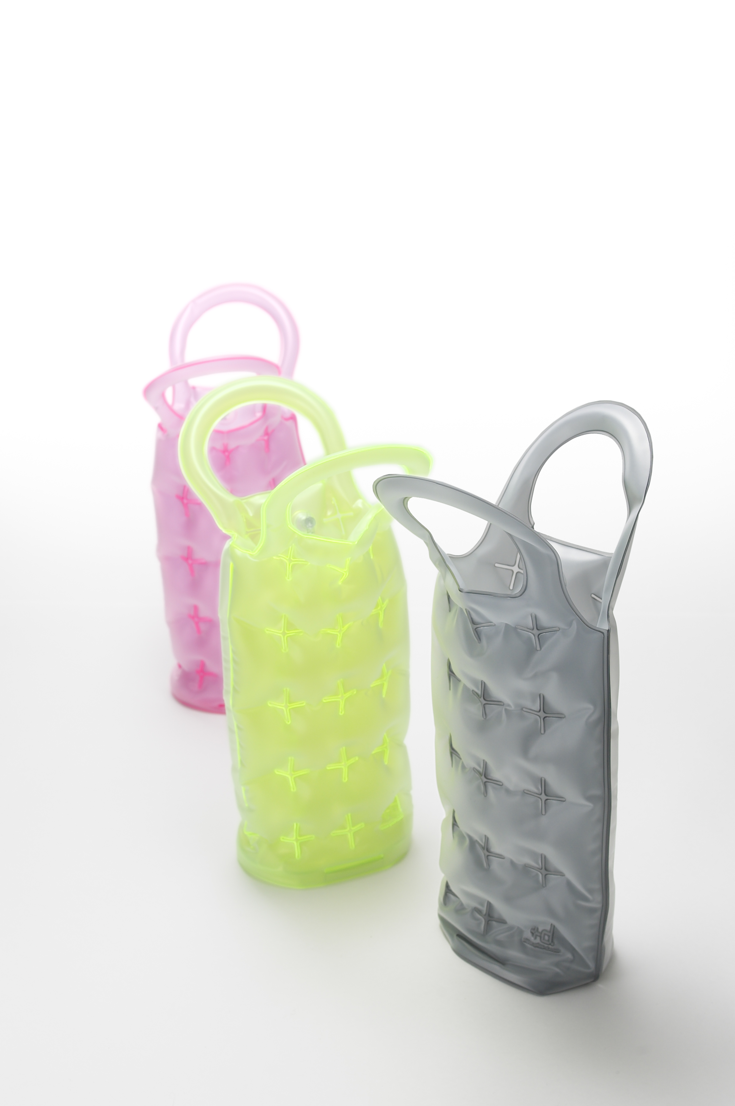 そのオリジナルブランド「+d」より発売中の「Kuuki」は、底面の直径約90mmまでの750mlボトル1本が入るサイズのバッグ。エアプラグから息を吹き込んだり、エアーポンプで空気を入れることで膨らみ、空気のクッションがボトルを衝撃から守ってくれます。空気を抜けばコンパクトに収納でき、かさばらないのも魅力。