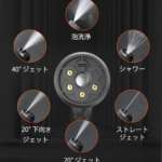 ヘッドにはシャワー、ストレートジェット、泡洗浄など6種類が搭載されており、用途に合わせてワンタッチで噴射の種類を切り替えることができます。