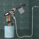使用時は、別途用意したバケツの水を用いますが、5mのホースの届く範囲なら自由に動き回れ、また水を吸い上げるホースの先端には、ゴミを吸い上げないようフィルターがついているので、お風呂の残り湯や川の水を使うこともできます。さらに水道からの直接セッティングも可能。