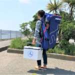 空気を注入するインフレータブルタイプのため、全ての道具は、ボードを収納する専用バッグとクーラーボックスの2個に集約でき、軽自動車でも余裕の積載&電車等での釣行も可能になります。パドル、リーシュコード(パドルと足を繋ぐロープ)、リペアキット、フィン(足ヒレ)も同梱されます。