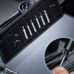 約40分のフル充電でネジ装着/外しは約500回、連続稼働時間は約2時間、待機時間は約180日。付属する精密ビットは全部で24種類あり、貯蔵ケースに18個、収納台座に6個収納しています。さらに、付属品としてピンセットなど全10個のツールが同梱され、ドライバー本体を含めて全て収納が可能。マグネット+目盛り付きで効率よく作業を行えます。