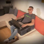 「Couchmaster」は2つのクッションと天板からなるパソコンデスクで、ソファやベッドの上に置いて活用します。デスクや椅子を置くための新たなスペースを作る必要がなく、ソファの上にポンと置くだけで使えるんです。