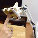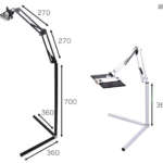 土台は90度に開いた2本の足で構成。前に重心がかかってもしっかりと支えます。スマートフォンとタブレットのホルダーがそれぞれ付属し、タブレットは最大12.9インチまで取付可能です。