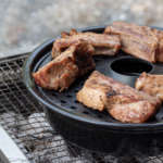 ドーナツ型水受け鍋は、中央に穴が開いており、火元から直接熱を受けるために輻射熱もより高音に。また、フタの側面には穴が空けてあるため、水蒸気が鍋内にこもらない仕様。この構造のおかげで、水を入れてフタをした状態でも肉や魚をしっかりと焼くことができるというわけです。