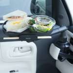 テーブルの耐荷重は2kgで十分な広さ面積を確保しているので、フード類をテーブルに置いて車内での飲食にも最適。スリット部分は箸置きとして使用もできます。