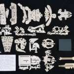 メタル工作のアルミ製の部品は、すべて平面パーツになっています。パーツには、硬いアルミ板と柔らかいアルミ板の2種類があり、アルミ板をボルト・ナットで固定したり曲げたりすることで、徐々に立体的なホホジロザメが組み上がっていくのです。