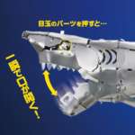 完成したホホジロザメは、全長18cmで机の上に飾るのにぴったり。目玉部分をプッシュすると、おおきな口が開いて牙をむくというギミックも面白いです。組み立て時間は、およそ2時間が目安になっています。