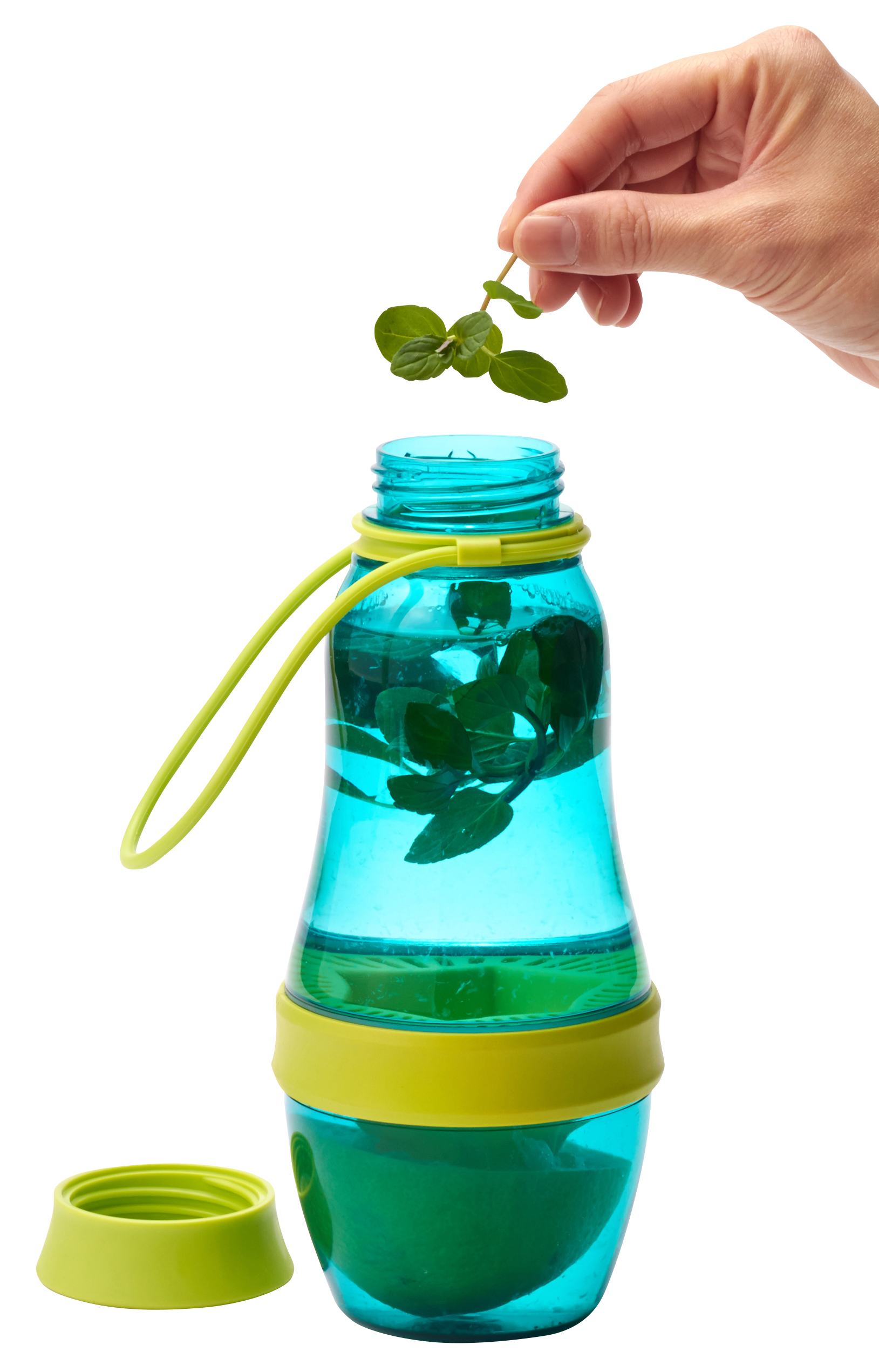 インフューズドウォーターの作り方はいたって簡単。ボトム部分のカップを外して逆さにしたら、レモンやライムなどのフルーツを絞りながらセット。フルーツはそのまま残してボトムカップを戻し、上から水や炭酸水を注いで水の場合はボトルをよく振れば、あっという間に出来上がりです。