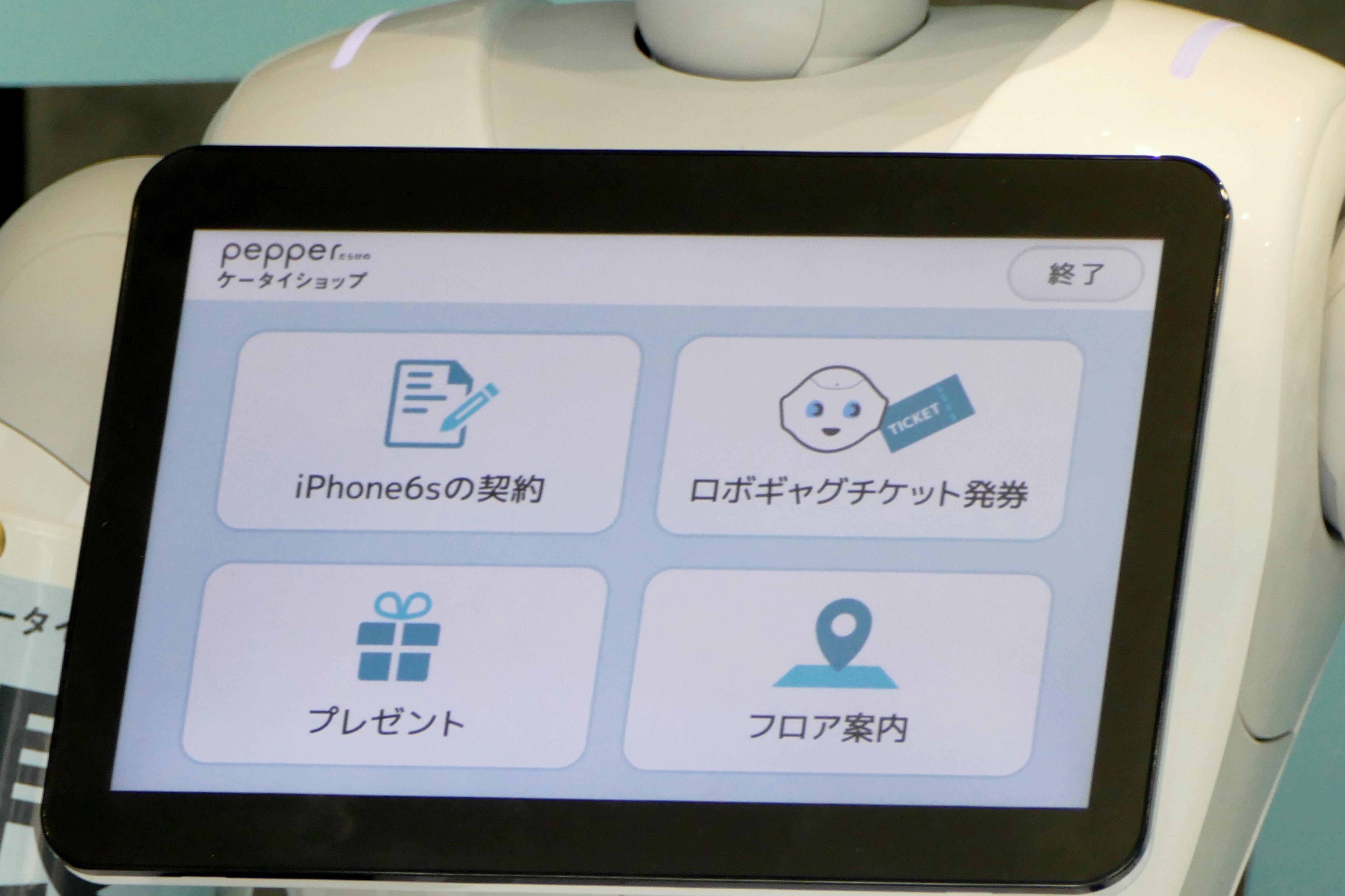 用件を選択する画面には「iPhone6sの契約」「ロボギャクチケット発券」「プレゼント」「フロア案内」の文字がチラリ。