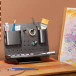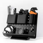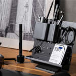 「Storage rack」は、職場のデスク周りなどこまごまとしたモノの整理収納に最適な収納ツール。基本となるのは220×285mmのアルミニウム合金製ボードと専用スタンドなのですが、このボードに専用パーツを組み合わせることで、理想の卓上収納コーナーを作ることができるのです。