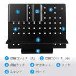 「Storage rack」セットは2種類が用意されていて、引っ掛け収納重視派なら大小コンテナにラックとマグネット、さらにフックふたつが同梱するAセットが最適。筆記用具など立てて収納するモノが多ければ、ラックとマグネットにコンテナ3つ(大2つ、小1つ)が付属するBセットがぴったりです。