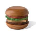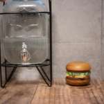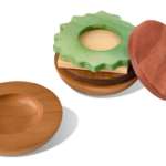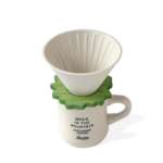 サンドされた3枚の具材(パテ、チーズ、トマト)は、コースターやケトルマット(鍋敷き)に。鮮やかなグリーンが目を引くレタスは、なぜか真ん中に大きな穴が…。実はこれ、コーヒードリッパーホルダー。リバーズで販売されているドリッパー「ケイブ」にぴったりはまるサイズなので、このレタスを使ってコーヒーを淹れてみるのも楽しそうです。