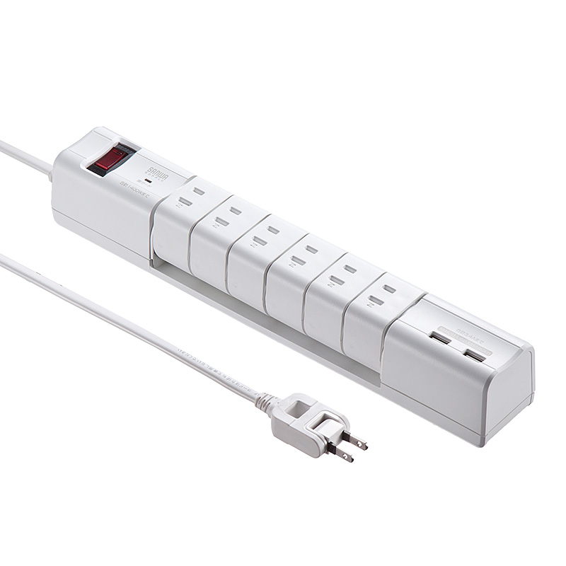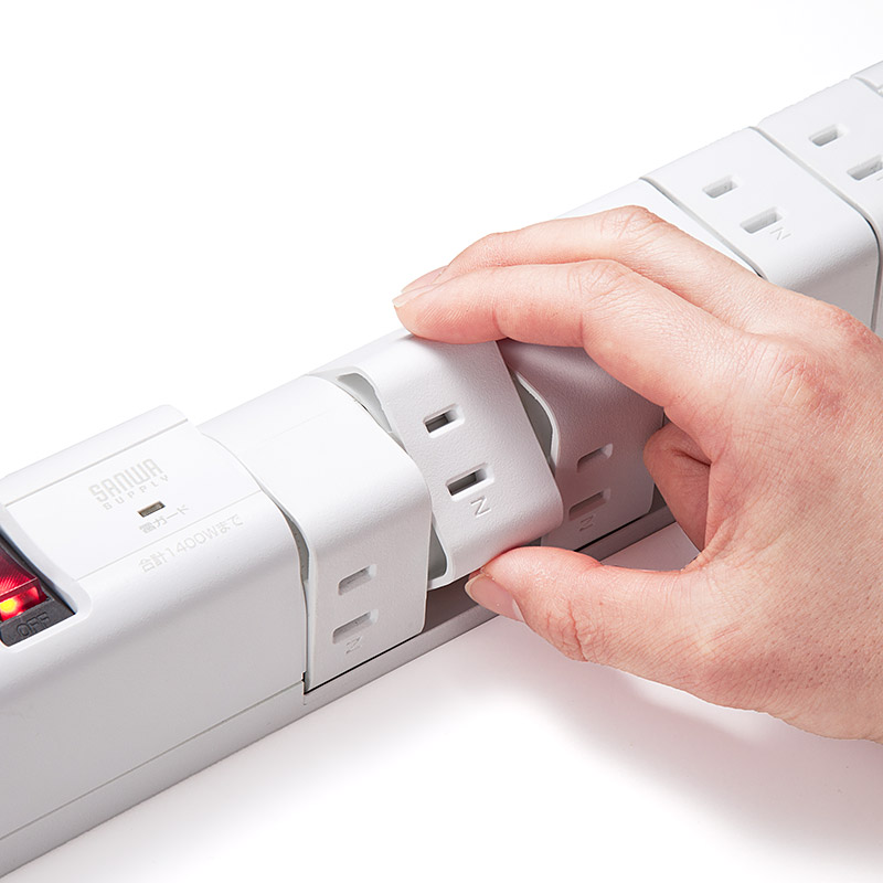 接続機器に合わせて向きが180°回転するから、コンセントが大きく、重なり合って困る場合に最適。スマートUSBは2ポートで合計3.4A、ACコンセントは6口。コンセント口を回転できるため、小さなスペースでもムダなく使える。使わないコンセント口は45°回転させるとシャッターが閉まり、ホコリの侵入を防ぐという心配りまで。