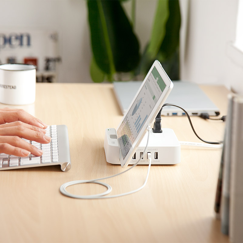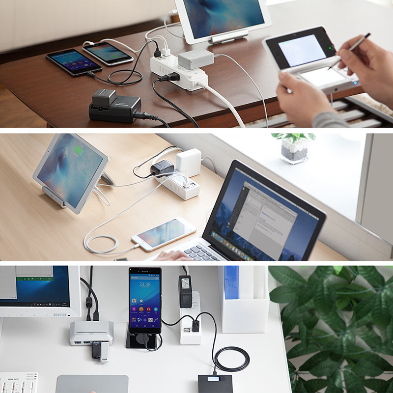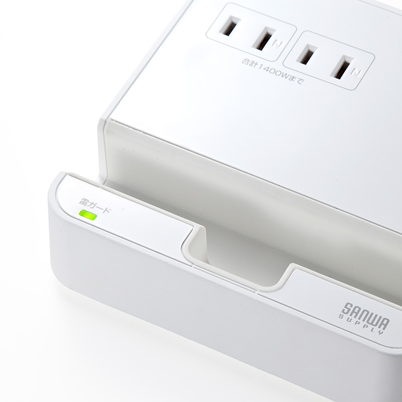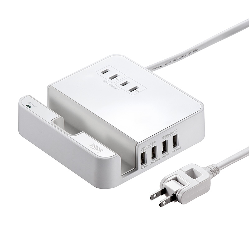 ACコンセントは2口と控えめだが、スマホ、タブレットスタンド付きなのが便利。USBポートは4口で、iOS端末向けに結線されたiPhoneやiPad用×2、androidやデジカメなどその他機器用×2。合計4.8A、1ポート最大出力2.4Aなのでタブレットの充電もOK。スタンドは幅18mmと余裕なのでタブレット、スマホどちらも置ける。