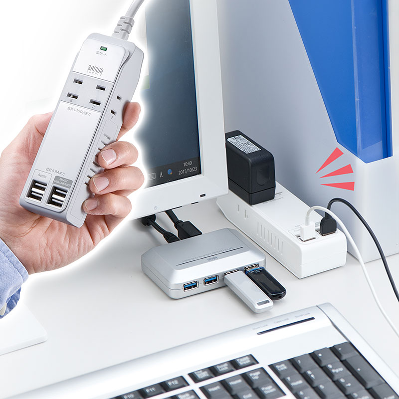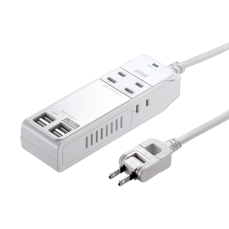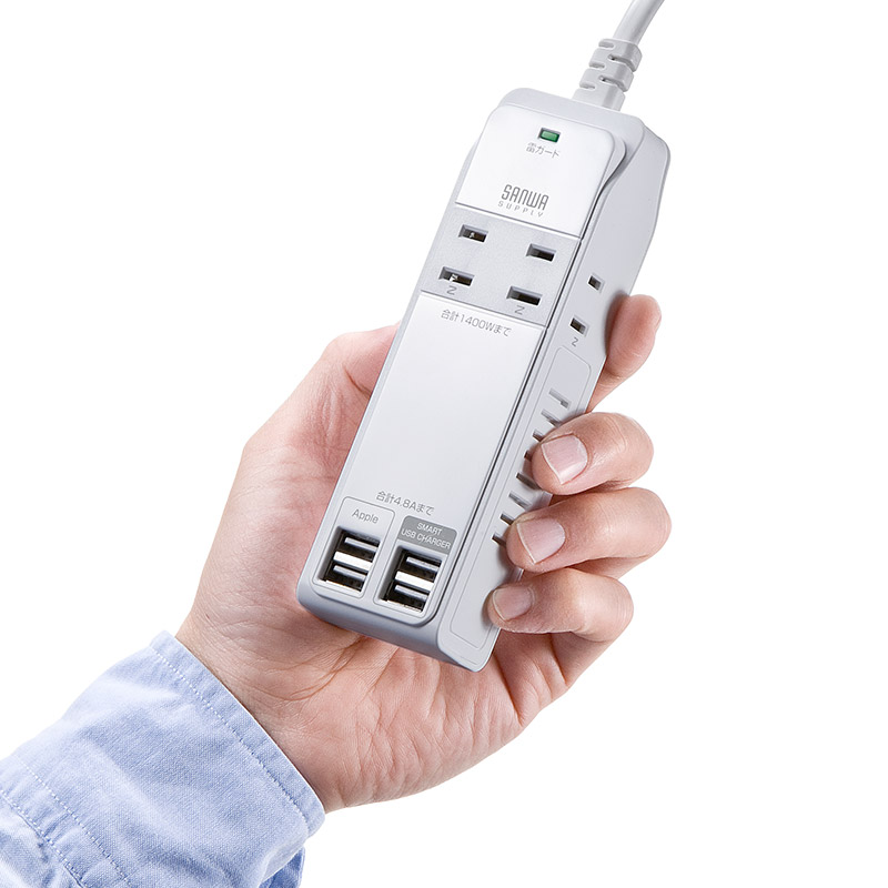 もっと電源コンセントが欲しいけれど、コンパクトさ重視なら電源4つのこのタイプ。コンセントとUSBが離れているから干渉しないのもポイント。コンセントは4つのうちサイドにふたつ配置され、大型アダプタも干渉しにくい。接続された機器を自動判別するスマートUSBはふたつ搭載、残りふたつはiOS端末向けに結線された、iPhoneやiPad用のUSBポート。USBは合計4.8A。