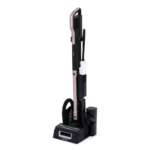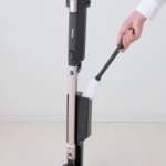 使用後は、スタンド土台に付属された金属製の “除電プレート” にホコリの付いたモップを差し込むと静電気が除電され、掃除機本体でモップに付いたホコリを吸引。繰り返し何度でもモップを使えます。モップの柄は伸縮するので、高い場所などにも対応できて便利。